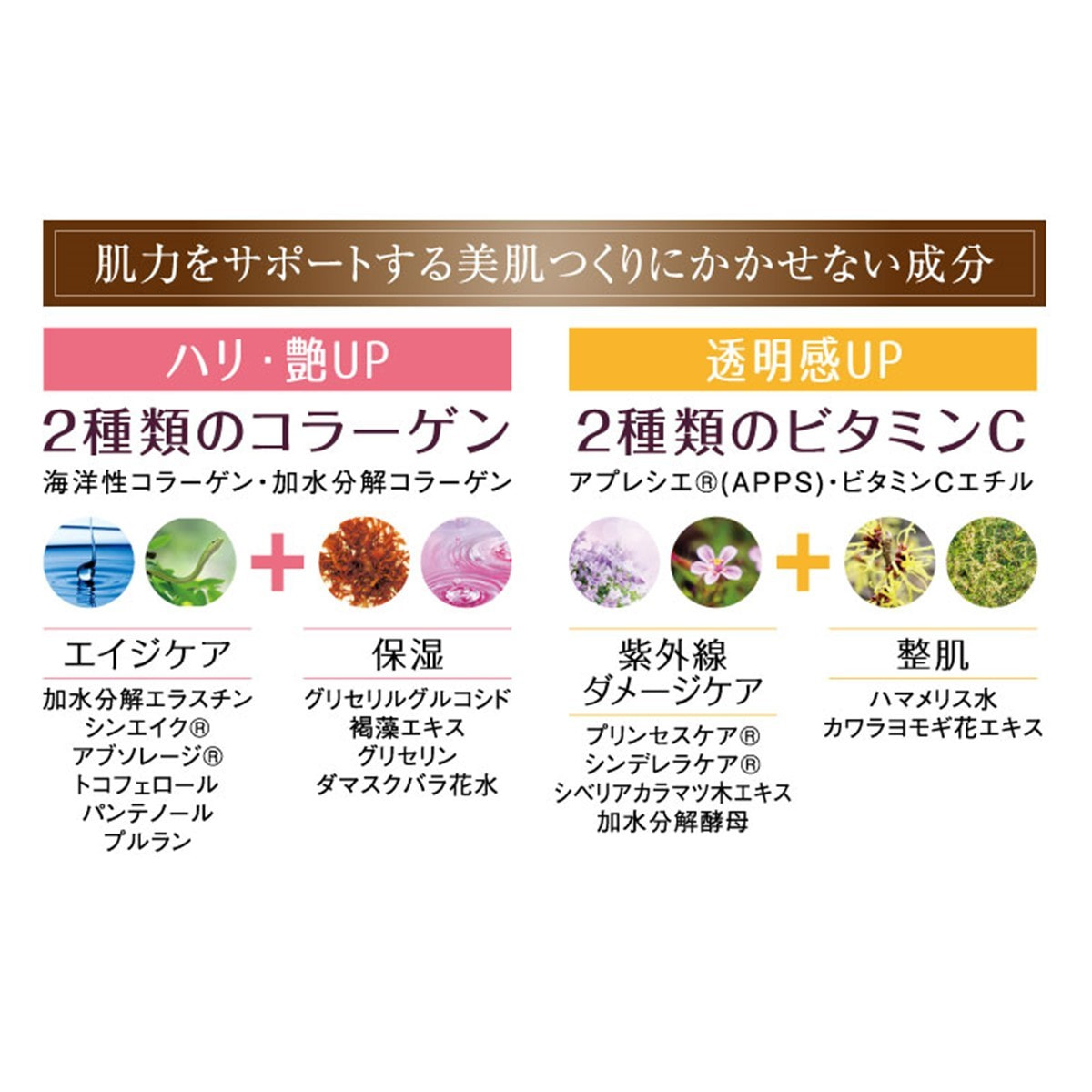 水、ダマスクバラ花水、BG、加水分解コラーゲン、プルラン、エタノール、PEG-60水添ヒマシ油、プロパンジオール、サクシノイルアテロコラーゲン、加水分解エラスチン、加水分解酵母、ハマメリス水、3-O-エチルアスコルビン酸、パルミチン酸アスコルビルリン酸3Na、パンテノール、ヒメフウロエキス、シベリアカラマツ木エキス、チョウジエキス、ワイルドタイムエキス、カワラヨモギ花エキス、セイヨウオオバコ種子エキス、ジ酢酸ジペプチドジアミノブチロイルベンジルアミド、ヒトオリゴペプチド-1、アルゲエキス、酢酸トコフェロール、1,2-ヘキサンジオール、カプリル酸グリセリル、グリセリルグルコシド、グリセリン、ペンチレングリコール、ニオイテンジクアオイ油、PEG-20ソルビタンココエート、フェノキシエタノール