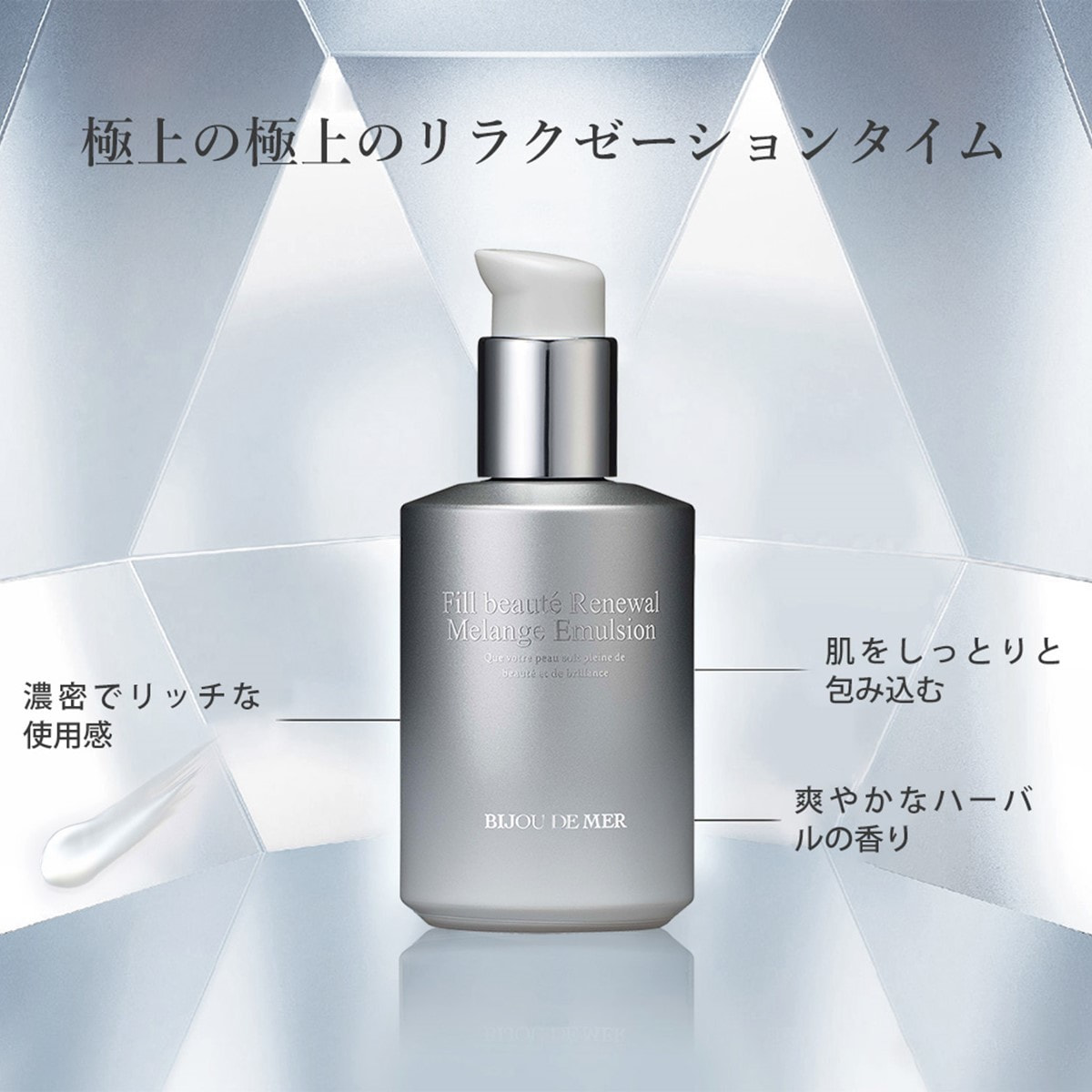 濃密でリッチな使用感の乳液状美容液が肌をしっとりと包み込み、爽やかなハーバルの香りが極上のお手入れタイムを演出します。