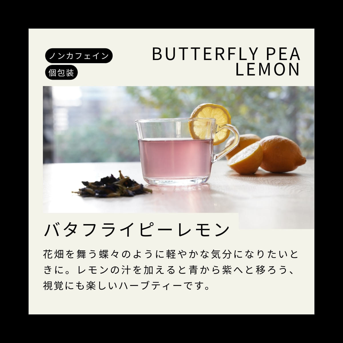 ホワイトハイビスカス、バタフライピー、レモングラス、ペパーミント、ジンジャー、レモンピール、ステビア、香料