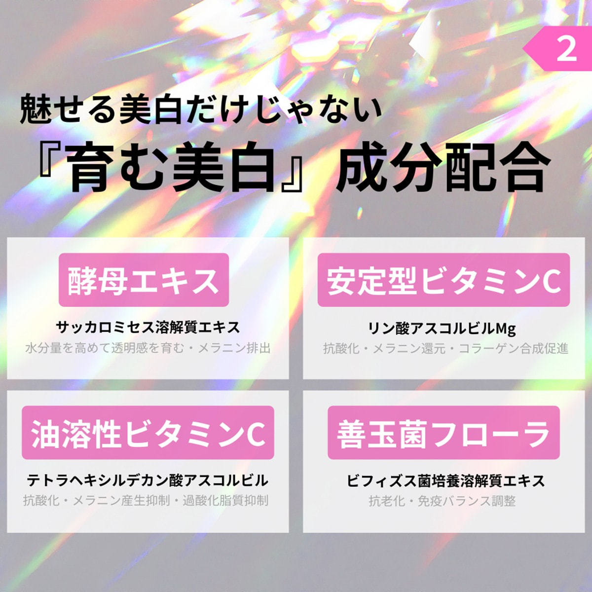 シクロペンタシロキサン、水、イソノナン酸イソノニル、ジフェニルシロキシフェニルトリメチコン、グリセリン、イソノナン酸イソトリデシル、トリエチルヘキサノイン、BG、PEG-9ポリジメチルシロキシエチルジメチコン、ポリヒドロキシステアリン酸、セチルPEG/PPG-10/1ジメチコン、サッカロミセス溶解質エキス、リン酸アスコルビルMg、テトラヘキシルデカン酸アスコルビル 、ビフィズス菌培養溶解質、アーチチョーク葉エキス、ヒアルロン酸Na、トコフェロール 、セレブロシド 、グリコシルトレハロース 、チョウジエキス、カワラヨモギ花エキス、トリエトキシカプリリルシラン、ポリグルタミン酸、加水分解水添デンプン、トリメチルシロキシケイ酸 、カプリル酸グリセリル、イソステアリン酸、ジメチコン、メチコン、(ジメチコン/ビニルジメチコン)クロスポリマー、ハイドロゲンジメチコン、硫酸Mg、ペンチレングリコール 、フェノキシエタノール、酸化チタン、酸化亜鉛、酸化鉄、水酸化Al、シリカ、マイカ